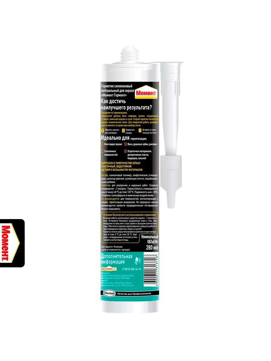 | Подробная комплектация | Герметик силиконовый нейтральный для зеркал Момент Гермент прозрачный 280 мл. |