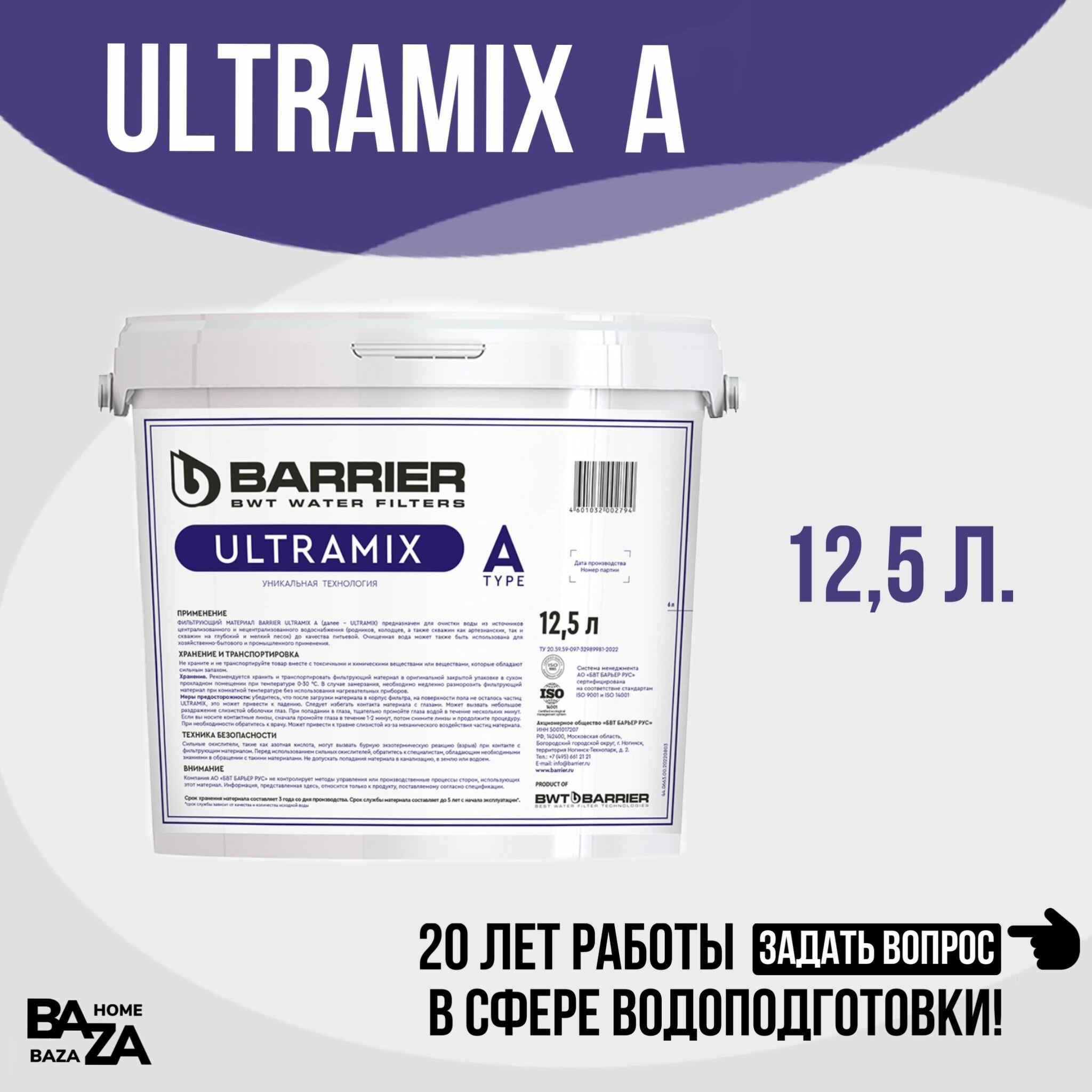 БАРЬЕР ультрамикс А, фильтрующий материал для системы очистки воды из скважины, при незначительном содержании органических соединений, ведро 12,5 л