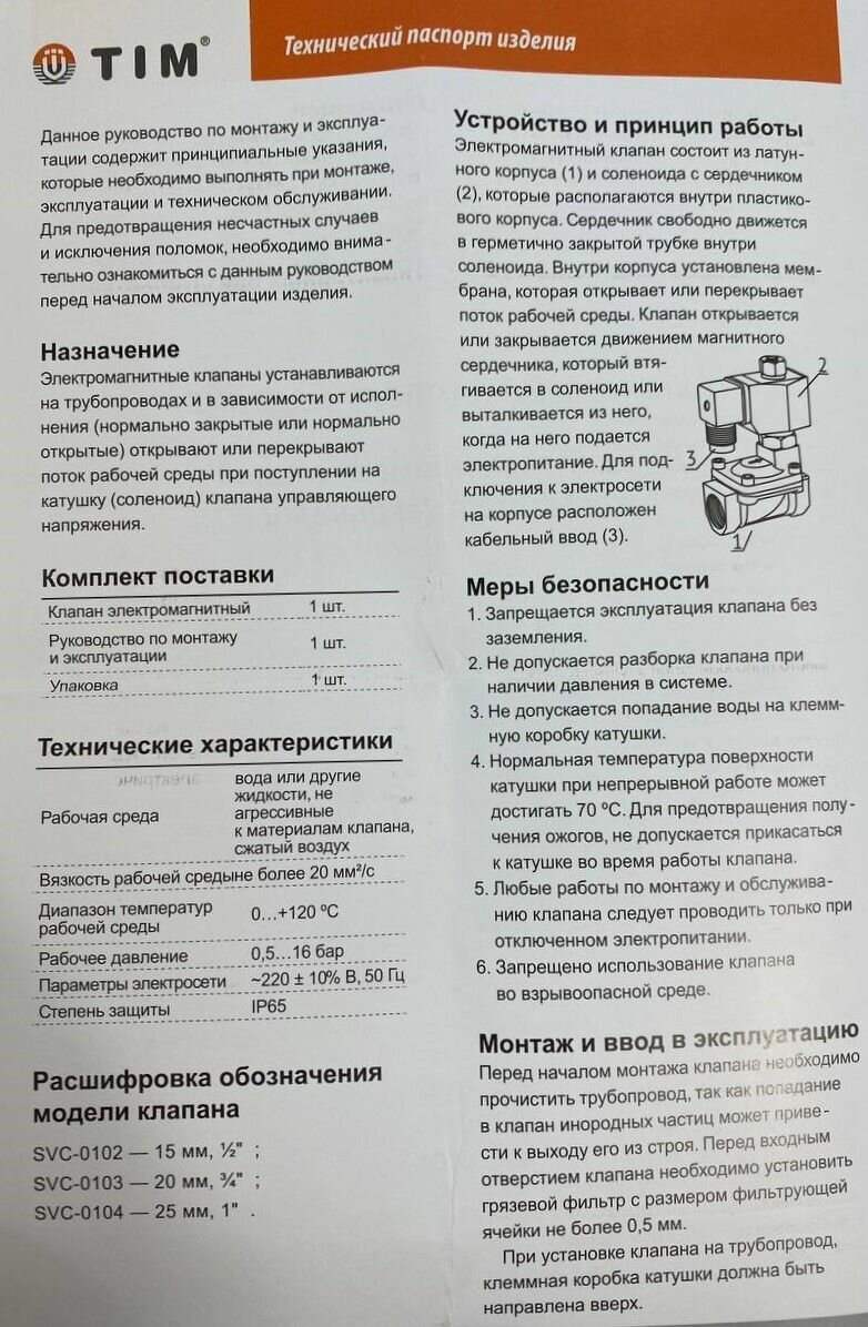 Клапан электромагнитный соленоидный нормально закрытый латунный 3/4"(ДУ20), 220В, TIM артикул SVC-0103 интересное:
