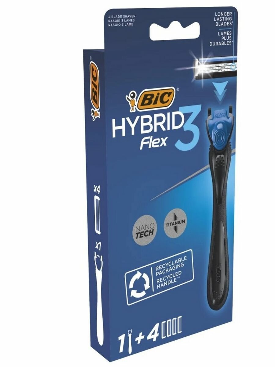 | Дополнительная информация | BIC Hybrid 3 Flex - это мужская бритвенная система, где три подвижных нанотехнологичных лезвия, индивидуально подстраиваются под контуры лица для тщательного и гладкого бритья. Каждая кассета оснащена специальной увлажняющей полоской на плавающей головке. Бритва изготовлена в Европе на заводах BIC и проходит более 25 тестов контроля качества. |