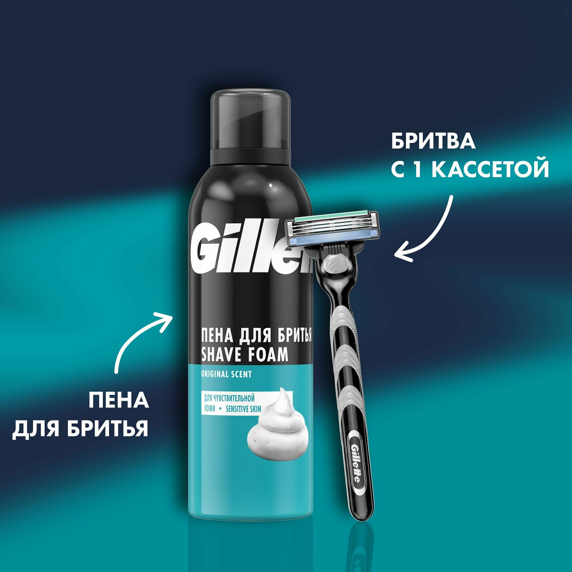 | Комплектация | Многоразовый бритвенный станок Mach3 1 шт, сменная кассета 1 шт и пена для бритья Gillette Classic Sensitive 200 мл |