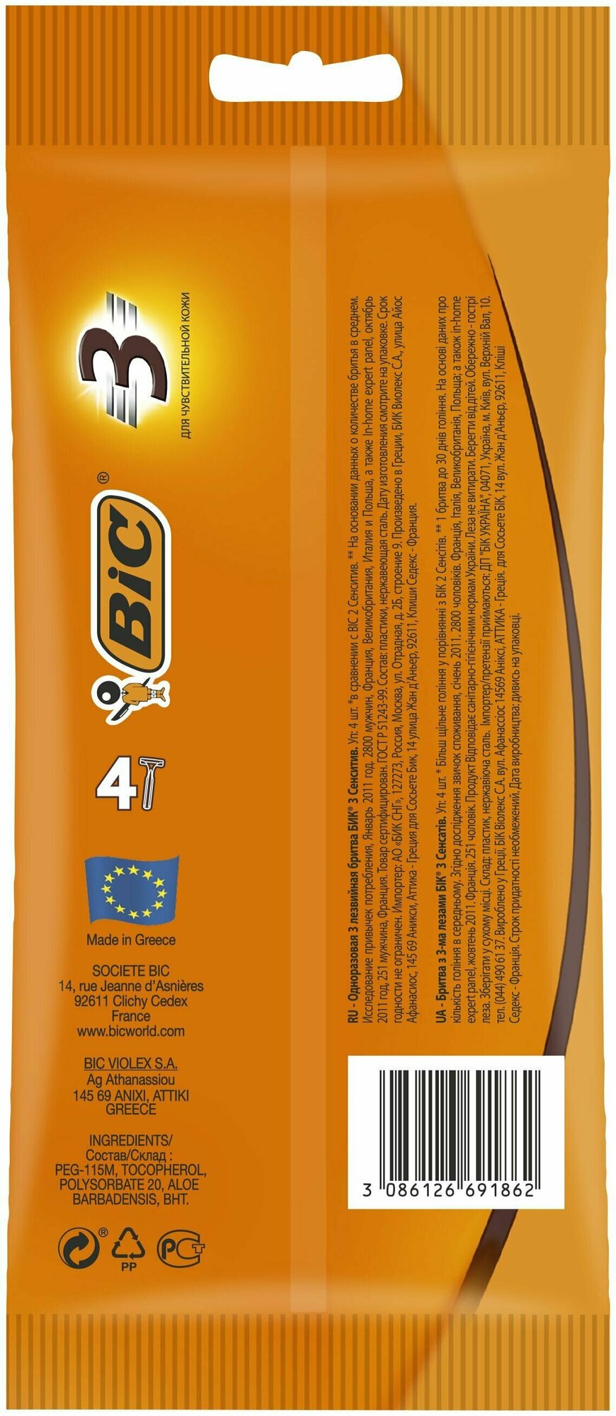 | Комплектация | Бритвы одноразовые, BIC "3 Sensitive", 3-лезв.,увл.полоса, для чувств.кожи уп. 4 шт |