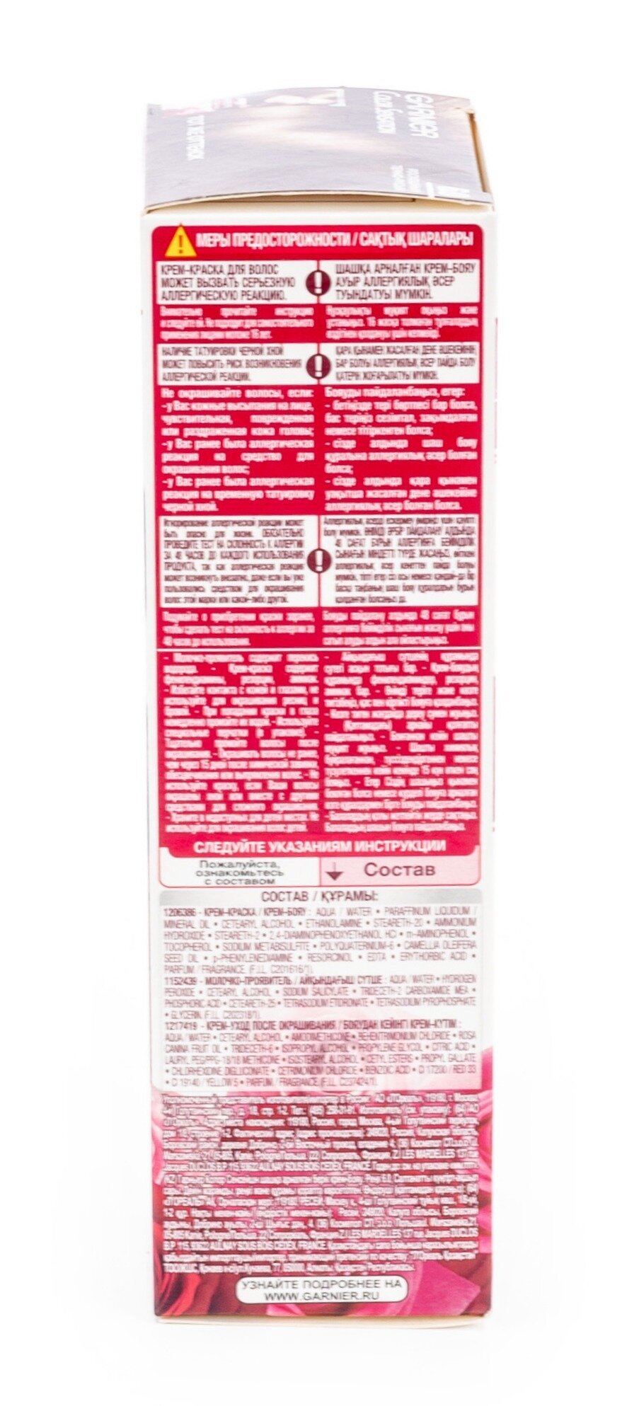 | Способ применения | мешайте крем-краску и молочко-проявитель. Нанесите на волосы. Подождите рекомендованное на упаковке время и смойте. Нанесите бальзам. Смойте. Для усиления защиты цвета от вымывания используйте шампунь для окрашенных волос |