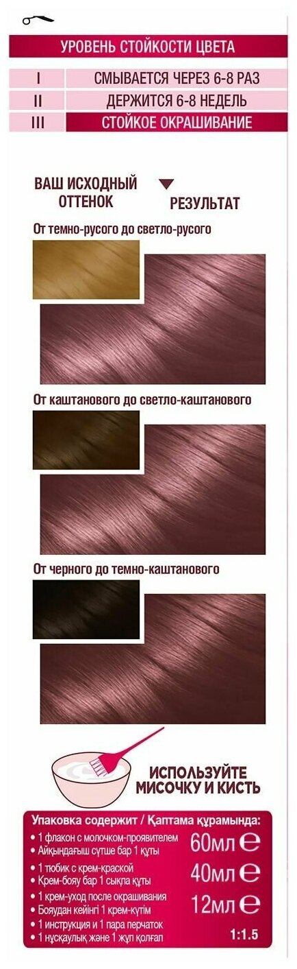 | Способ применения | мешайте крем-краску и молочко-проявитель. Нанесите на волосы. Подождите рекомендованное на упаковке время и смойте. Нанесите бальзам. Смойте. Для усиления защиты цвета от вымывания используйте шампунь для окрашенных волос |