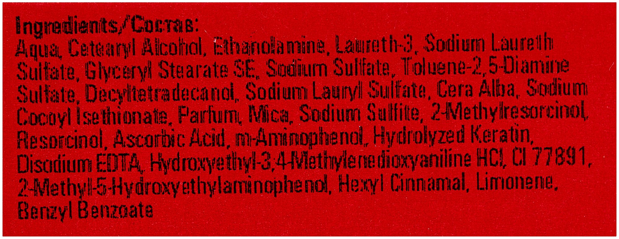 | Состав | aqua, cetearyl alcohol, ethanolamine, laureth-3, sodium laureth sulfate, sodium sulfate, glyceryl stearate se, decyltetradecanol, sodium lauryl sulfate, cera alba, sodium cocoyl isethionate, parfum, mica, sodium sulfite, toluene-2,5-diamine sulfate, ascorbic acid, hydrolyzed keratin, disidium edta, ci 77891, resorcinol, 2-methylresorcinol, hexyl cinnamal, 4-amino-2-hydroxytoluene, limonene, benzyl benzoate, m-aminophenol, 2,4-diaminophenoxyethanol hci, sodium hydroxide |