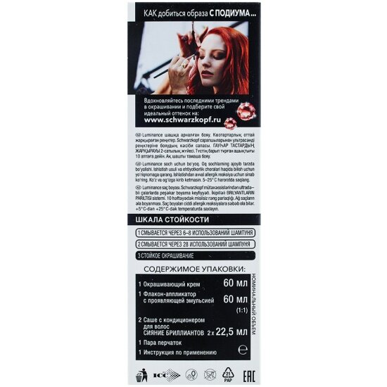 | Способ применения | накройте одежду полотенцем и наденьте перчатки, вложенные в набор, наносите окрашивающую смесь Люминанс на сухие невымытые волосы, приготовьте окрашивающую смесь выдавите все содержимое тюбика во флакон-аппликатор, закройте флакон и энергично взболтайте смесь до достижения однородности, в конце отвинтите колпачок наконечника флакона-аппликатора и немедленно начинайте нанесение, нанесите всю приготовленную смесь прядь за прядью по всей длине волос. Затем тщательно вмассируйте ее в волосы кончиками пальцев. Время воздействия: 30 минут, по окончании времени воздействия наденьте перчатки, вспеньте смесь на волосах с небольшим количеством теплой воды и тщательно промойте их, пока вода не станет прозрачной. |