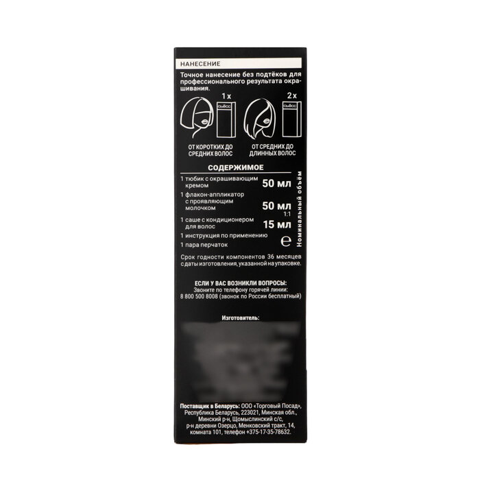 | Дополнительная информация | краски для волос могу вызывать серьезные аллергические реакции. Проведите тест на аллергическую реакцию. Продукт не предназначен для лиц младше 16 лет. Содержит перекись водорода. Избегать попадания в глаза |