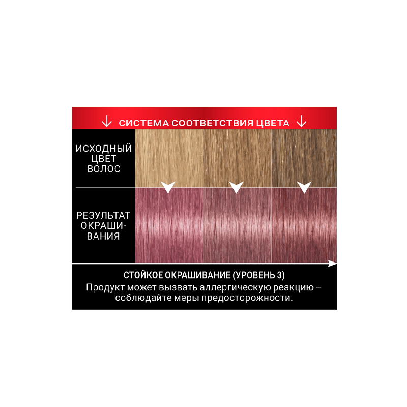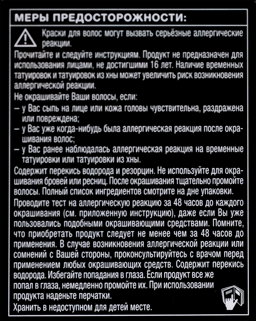 | Дополнительная информация | краски для волос могу вызывать серьезные аллергические реакции. Проведите тест на аллергическую реакцию. Продукт не предназначен для лиц младше 16 лет. Содержит перекись водорода. Избегать попадания в глаза |