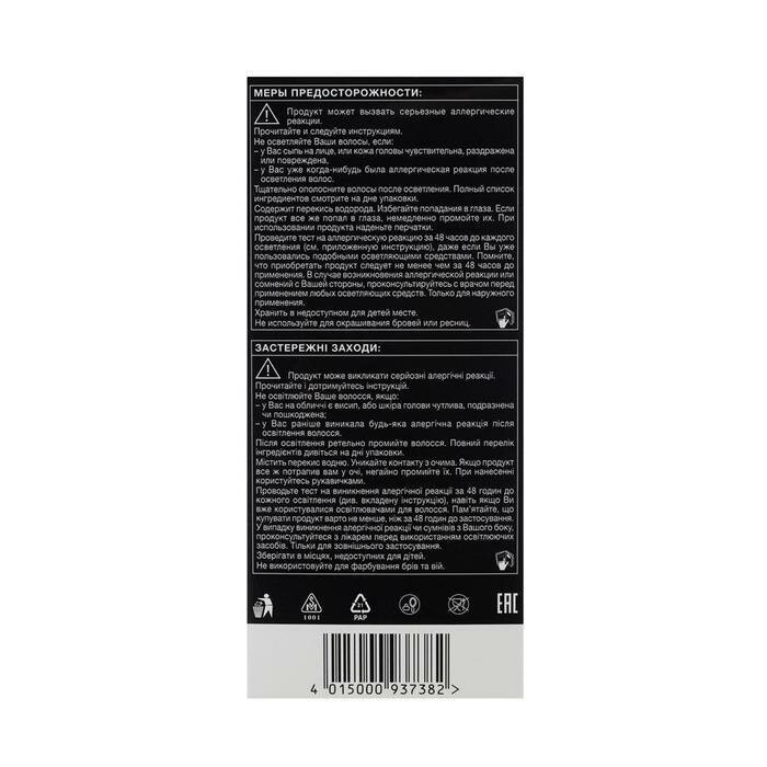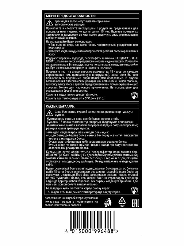 | Дополнительная информация | краски для волос могу вызывать серьезные аллергические реакции. Проведите тест на аллергическую реакцию. Продукт не предназначен для лиц младше 16 лет. Содержит перекись водорода. Избегать попадания в глаза |