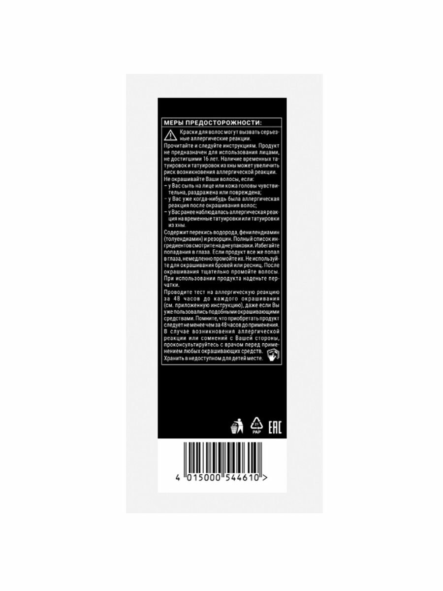 | Дополнительная информация | краски для волос могу вызывать серьезные аллергические реакции. Проведите тест на аллергическую реакцию. Продукт не предназначен для лиц младше 16 лет. Содержит перекись водорода. Избегать попадания в глаза |