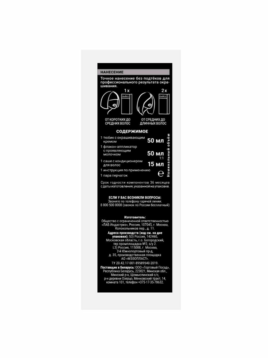 | Комплектация | окрашивающий крем - 50 мл, проявляющее молочко - 50 мл, кондиционер - 15 мл, 1 пара перчаток, инструкция по применению |