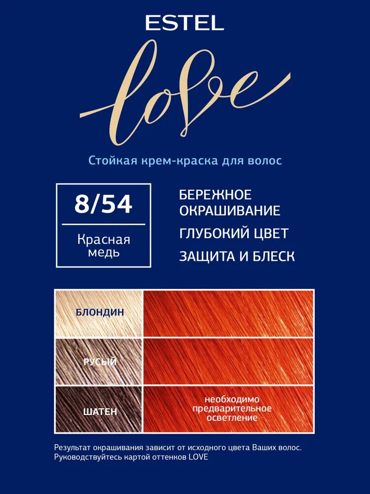 Ниже Вы можете прочитать отзывы на ESTEL LOVE Стойкая крем-краска для волос, тон 8/54 Красная медь, ознакомится с подробными характеристиками, посмотреть интересные обзоры и фотографии на ESTEL LOVE Стойкая крем-краска для волос, тон 8/54 Красная медь.