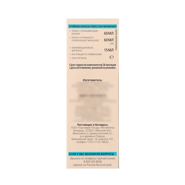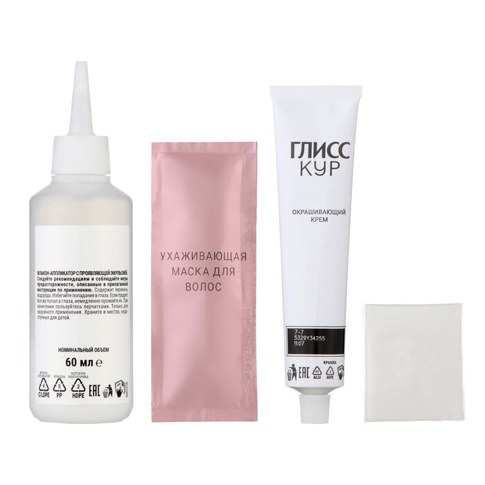 | Дополнительная информация | тюбик с окрашивающим кремом - 60 мл, флакон-аппликатор с проявляющей эмульсией - 60 мл, ухаживающая маска для волос - 22,5 мл |