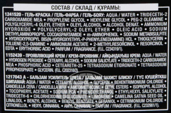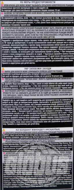 | Способ применения | перед началом окрашивания необходимо снять украшения и нанести крем по контуру лица, чтобы защитить кожу от попадания краски. Перед применением следует пройти тест на аллергическую реакцию. Внимательно прочтите инструкцию, следуйте ее рекомендациям |