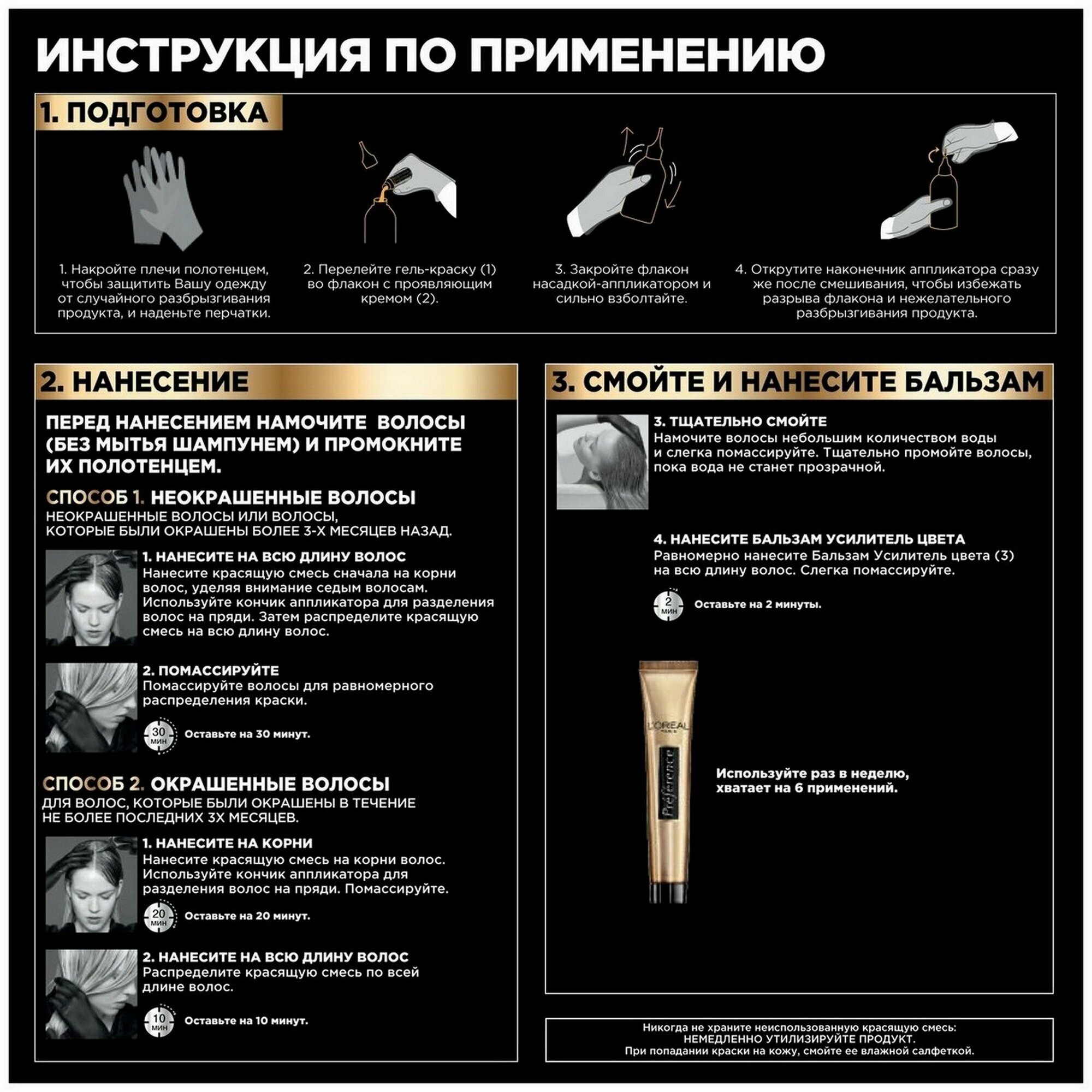 | Способ применения | перед началом окрашивания необходимо снять украшения и нанести крем по контуру лица, чтобы защитить кожу от попадания краски. Перед применением следует пройти тест на аллергическую реакцию. Внимательно прочтите инструкцию, следуйте ее рекомендациям |