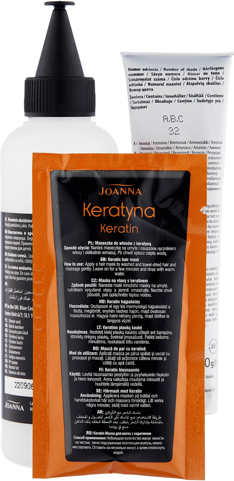 | Комплектация | тюбик с краской для волос 40 г; бутылка с окислителем в креме 60 г; маска с кератином в тюбике 20 г; информационный вкладыш; защитные перчатки |