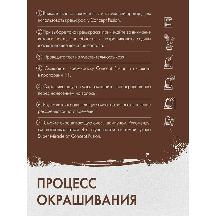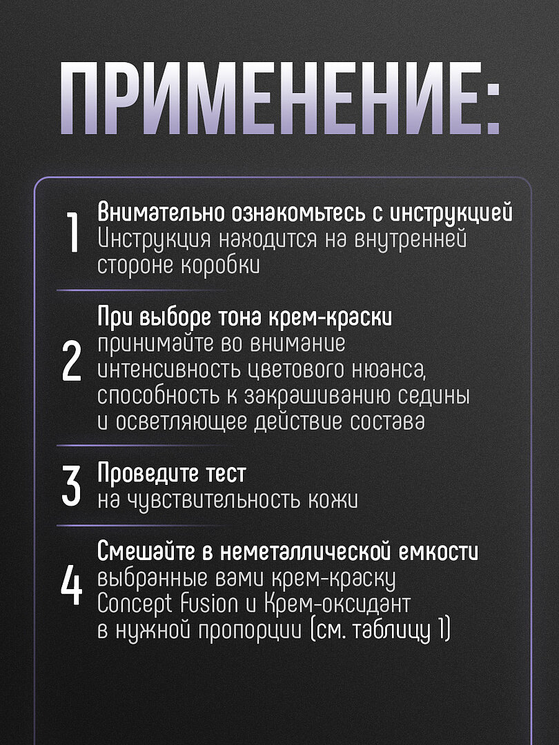 | Способ применения | Внимательно ознакомьтесь с инструкцией, прежде, чем использовать крем-краску Concept Fusion. При выборе тона крем-краски принимайте во внимание интенсивность, способность к закрашиванию седины и осветляющее действие состава. Проведите тест на чувствительность кожи. Смешайте крем-краску Concept Fusion и оксидант в пропорции 1:1. Окрашивающую смесь смешайте непосредственно перед нанесением на волосы. Выдержите окрашивающую смесь на волосах в течение рекомендованного времени. Смойте окрашивающую смесь шампунем. Рекомендуем воспользоваться 4-х ступенчатой системой ухода Super Miracle от Concept Fusion. |