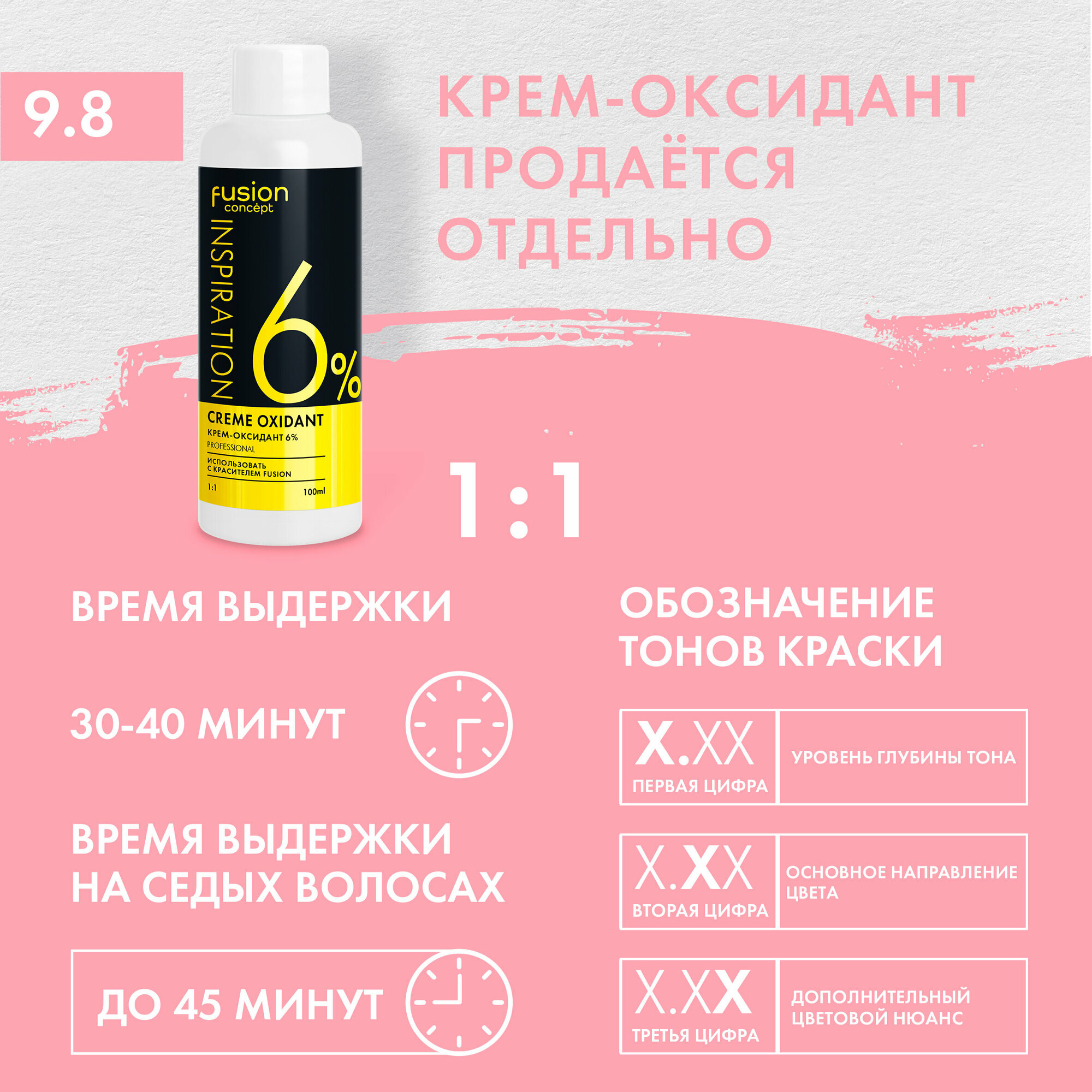 | Способ применения | Внимательно ознакомьтесь с инструкцией, прежде, чем использовать крем-краску Concept Fusion. При выборе тона крем-краски принимайте во внимание интенсивность, способность к закрашиванию седины и осветляющее действие состава. Проведите тест на чувствительность кожи. Смешайте крем-краску Concept Fusion и оксидант в пропорции 1:1. Окрашивающую смесь смешайте непосредственно перед нанесением на волосы. Выдержите окрашивающую смесь на волосах в течение рекомендованного времени. Смойте окрашивающую смесь шампунем. Рекомендуем воспользоваться 4-х ступенчатой системой ухода Super Miracle от Concept Fusion. |