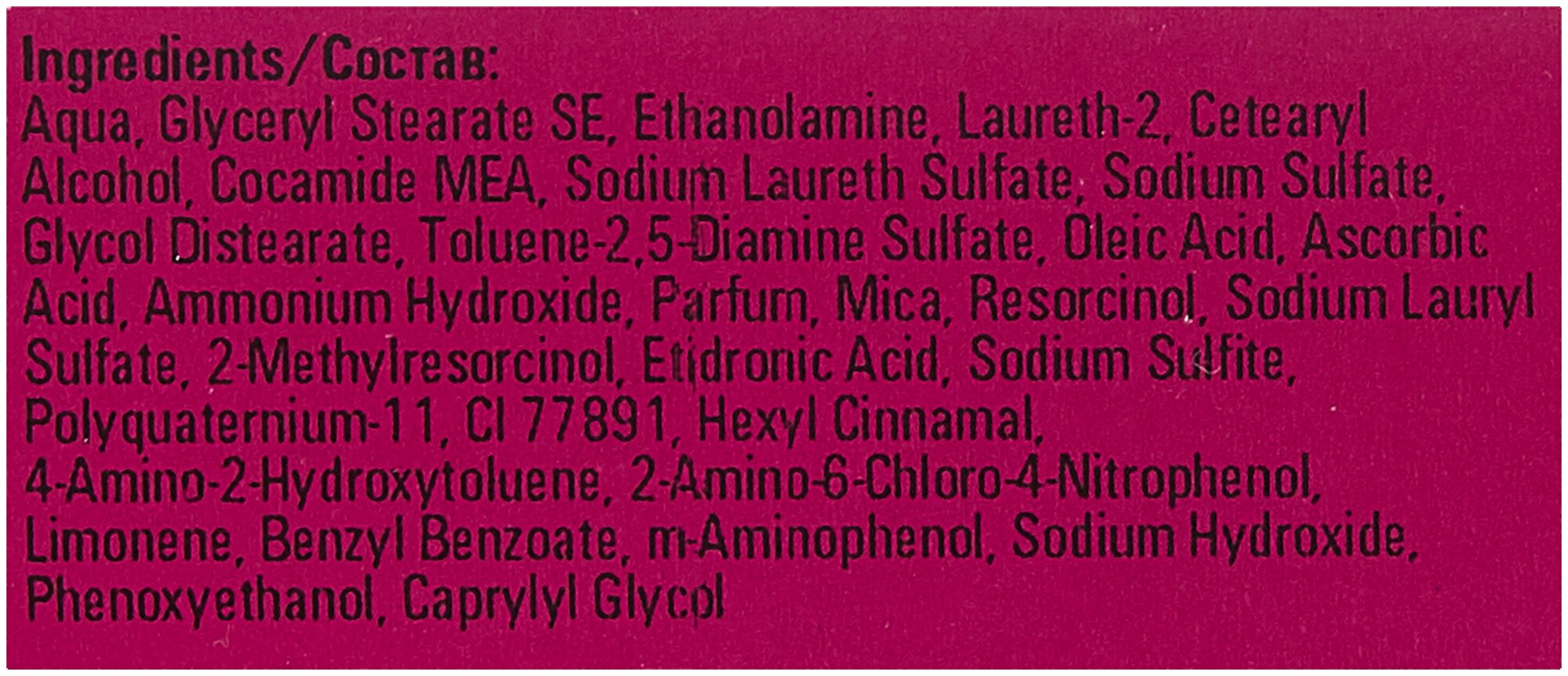 | Состав | aqua, cetearyl alcohol, ethanolamine, laureth-3, sodium laureth sulfate, toluene-2,5 diamine sulfate, glyceryl stearate se, sodium sulfate, decyltetradecanol, sodium lauryl sulfate, cera alba, parfum, sodium cocoyl isethionate, mica, hydroxyethyl-3,4-methylenedioxyaniline hci, resorcinol, sodium sulfate, m-aminophenol, ascorbic acid, hydrolyzed keratin, disidium edta, 2-methylresorcinol, ci 77891, hexyl cinnamal, limonene, benzyl benzoate |