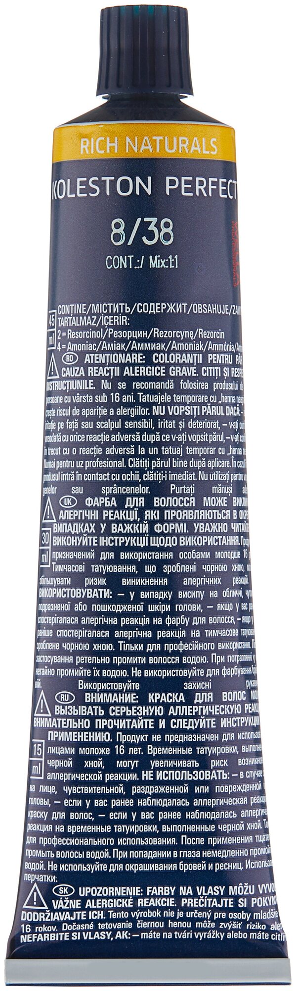 | Способ применения | приготовление смеси: смешайте краску с окислителем Welloxon Perfect в пропорции 1:1; окрашивание всех волос: намочите волосы; распределите краску на волосах и равномерно прочешите. Время выдержки с теплом 15 минут; без тепла 20 минут; окрашивание отросших корней: нанесите красящую смесь только на прикорневую часть; с теплом на 15 минут, без тепла 20 минут.осветление: нанести красящую смесь только по длине волос и концы; с теплом 10 минут, без тепла 20 минут; или нанести на прикорневую часть; с теплом 15-25 минут, без тепла 30-40 минут;по истечении времени тщательно смойте остатки краски водой, применяя шампунь Wella для окрашенных волос |