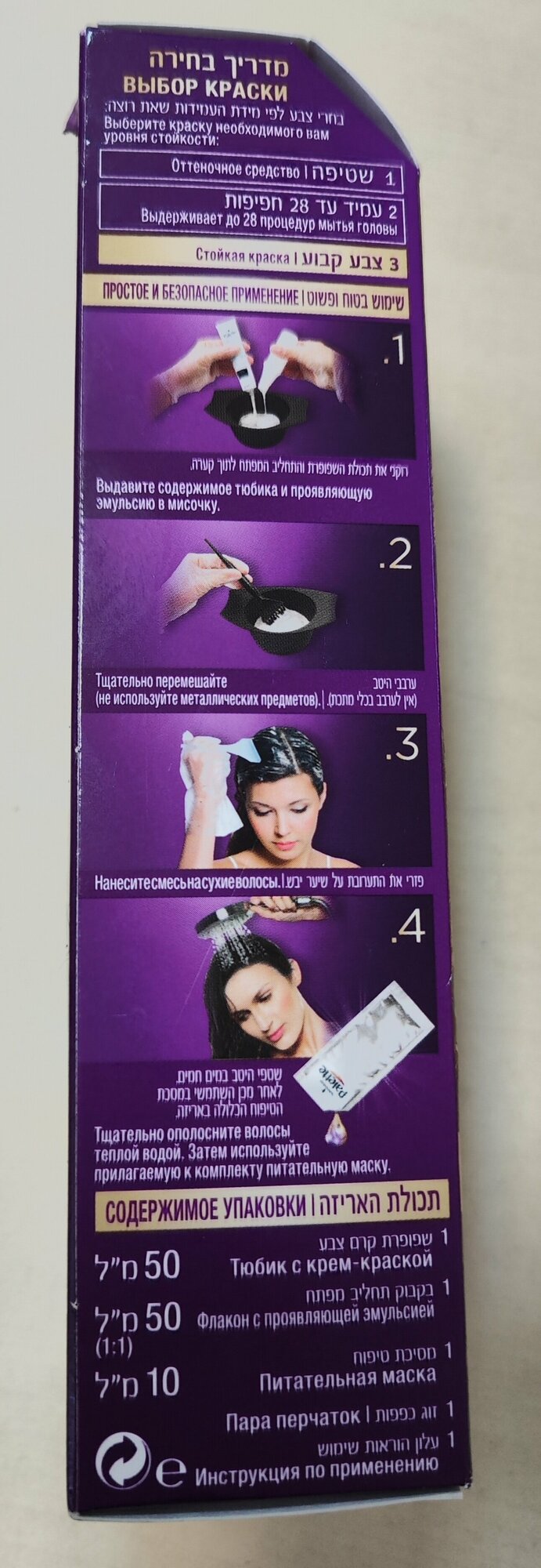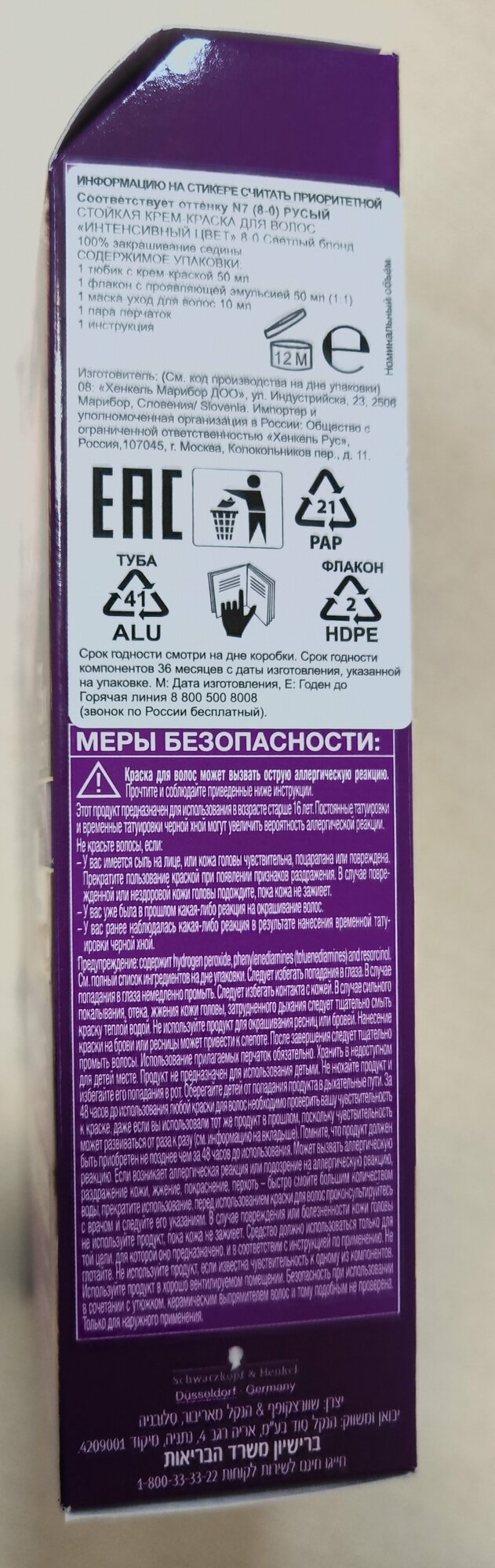 | Дополнительная информация | краски для волос могу вызывать серьезные аллергические реакции; проведите тест на аллергическую реакцию; продукт не предназначен для лиц младше 16 лет; содержит перекись водорода; избегать попадания в глаза |