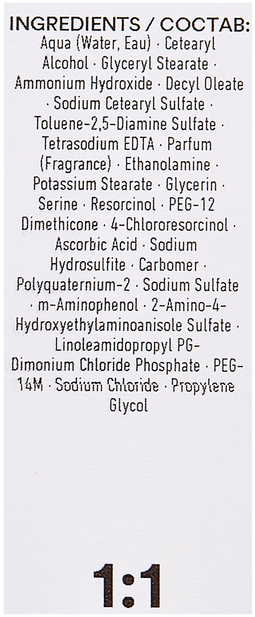 | Состав | aqua (water, eau), cetearyl alcohol, glyceryl stearate, ammonium hydroxide, decyl oleate, sodium cetearyl sulfate, tetrasodium edta, parfum (fragrance), potassium stearate, glycerin, ethanolamine, toluene-2,5-diamine sulfate, serine, peg-12 dimethicone, ascorbic acid, sodium hydrosulfite, 2-methylresorcinol, carbomer, polyquaternium-2, sodium sulfate, 4-chlororesorcinol, resorcinol, 4-amino-m-cresol, linoleamidopropyl pg-dimonium chloride phosphate, peg-14m, sodium chloride, propylene glycol, m-aminophenol |