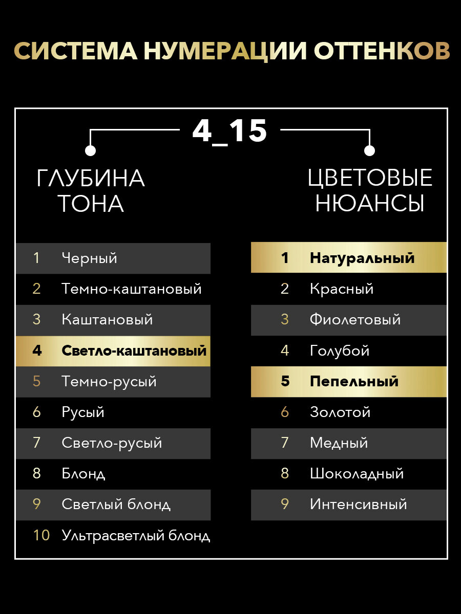 | Цвет товара | 1-10 Глубокий чёрный, 10-00 ультра-светлый блонд, 10-05 Жемчужный блонд, 10-50 Дымчатый блонд, 12-00 Платиновый блонд экстра, 2-10 чёрно-каштановый, 3-10 глубокий каштановый, 3-82 Красное дерево, 3-86 Темный Шоколад, 4-15 Ореховый каштановый, 4-18 Шоколадный каштановый, 4-50 Графитовый каштановый, 4-60 Золотистый каштановый, 5-10 натуральный каштановый, 5-28 Горячий Шоколад, 5-77 Глянцевая бронза, 5-86 Карамельный каштановый, 6-10 Тёмно-русый, 6-55 Пепельный темно-русый, 6-76 Мерцающий медный, 6-80 Золотистый русый, 7-10 Натуральный светло-русый, 7-58 Холодный русый, 7-70 Золотое манго, 8-05 Натуральный блонд, 8-50 натуральный пепельный блонд, 8-60 Медовый блонд, 8-70 Янтарный блонд, 8-86 Золотистый светло-русый, 9-10 Яркий блонд, 9-11 Холодный блонд, 9-60 Песочный блонд |