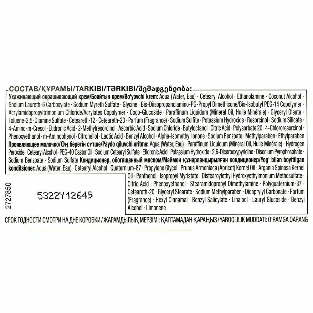 | Дополнительная информация | окрашивающий крем - 50 мл, флакон-аппликатор с проявителем - 50 мл, кондиционер - 15 мл |