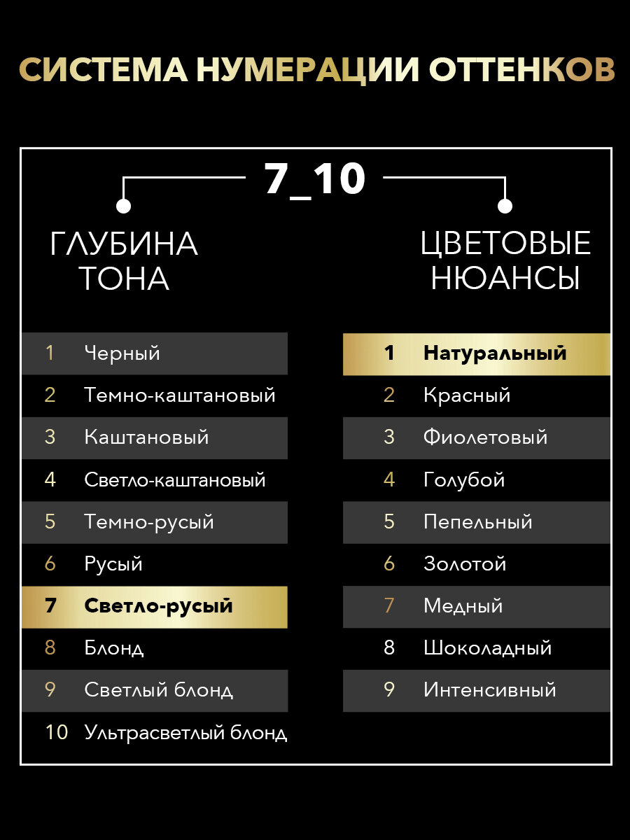 | Цвет товара | 1-10 Глубокий чёрный, 10-00 ультра-светлый блонд, 10-05 Жемчужный блонд, 10-50 Дымчатый блонд, 12-00 Платиновый блонд экстра, 2-10 чёрно-каштановый, 3-10 глубокий каштановый, 3-82 Красное дерево, 3-86 Темный Шоколад, 4-15 Ореховый каштановый, 4-18 Шоколадный каштановый, 4-50 Графитовый каштановый, 4-60 Золотистый каштановый, 5-10 натуральный каштановый, 5-28 Горячий Шоколад, 5-77 Глянцевая бронза, 5-86 Карамельный каштановый, 6-10 Тёмно-русый, 6-55 Пепельный темно-русый, 6-76 Мерцающий медный, 6-80 Золотистый русый, 7-10 Натуральный светло-русый, 7-58 Холодный русый, 7-70 Золотое манго, 8-05 Натуральный блонд, 8-50 натуральный пепельный блонд, 8-60 Медовый блонд, 8-70 Янтарный блонд, 8-86 Золотистый светло-русый, 9-10 Яркий блонд, 9-11 Холодный блонд, 9-60 Песочный блонд |