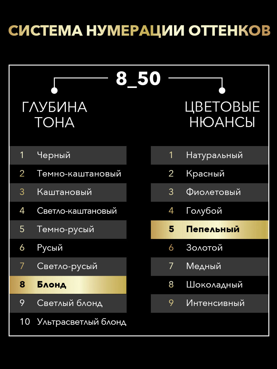 | Цвет товара | 1-10 Глубокий чёрный, 10-00 ультра-светлый блонд, 10-05 Жемчужный блонд, 10-50 Дымчатый блонд, 12-00 Платиновый блонд экстра, 2-10 чёрно-каштановый, 3-10 глубокий каштановый, 3-82 Красное дерево, 3-86 Темный Шоколад, 4-15 Ореховый каштановый, 4-18 Шоколадный каштановый, 4-50 Графитовый каштановый, 4-60 Золотистый каштановый, 5-10 натуральный каштановый, 5-28 Горячий Шоколад, 5-77 Глянцевая бронза, 5-86 Карамельный каштановый, 6-10 Тёмно-русый, 6-55 Пепельный темно-русый, 6-76 Мерцающий медный, 6-80 Золотистый русый, 7-10 Натуральный светло-русый, 7-58 Холодный русый, 7-70 Золотое манго, 8-05 Натуральный блонд, 8-50 натуральный пепельный блонд, 8-60 Медовый блонд, 8-70 Янтарный блонд, 8-86 Золотистый светло-русый, 9-10 Яркий блонд, 9-11 Холодный блонд, 9-60 Песочный блонд |