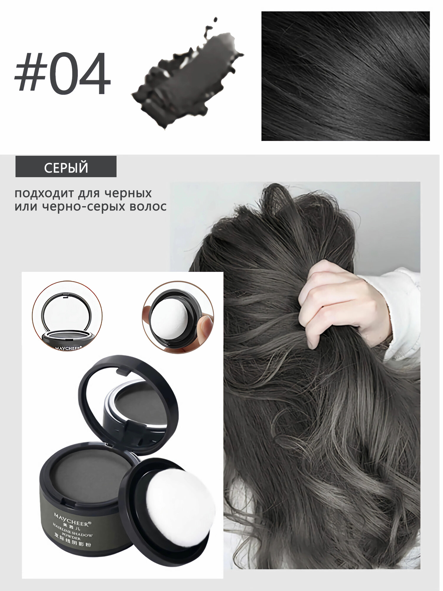 Пудра для тонирующая волос, Тени для закрашивания седины, 4г, maycheer, серый, загуститель маскирующий
