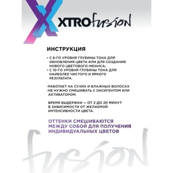 | Способ применения | Применение: используйте защитные перчатки (кроме нитриловых). Равномерно распределите на предварительно обесцвеченные волосы, избегая попадания на кожу. Время выдержки - до 20 минут в зависимости от желаемой степени интенсивности цвета. Для максимальной яркости и стойкости используйте дополнительное тепло. По истечении времени воздействия смойте прохладной водой без использования шампуня. |
