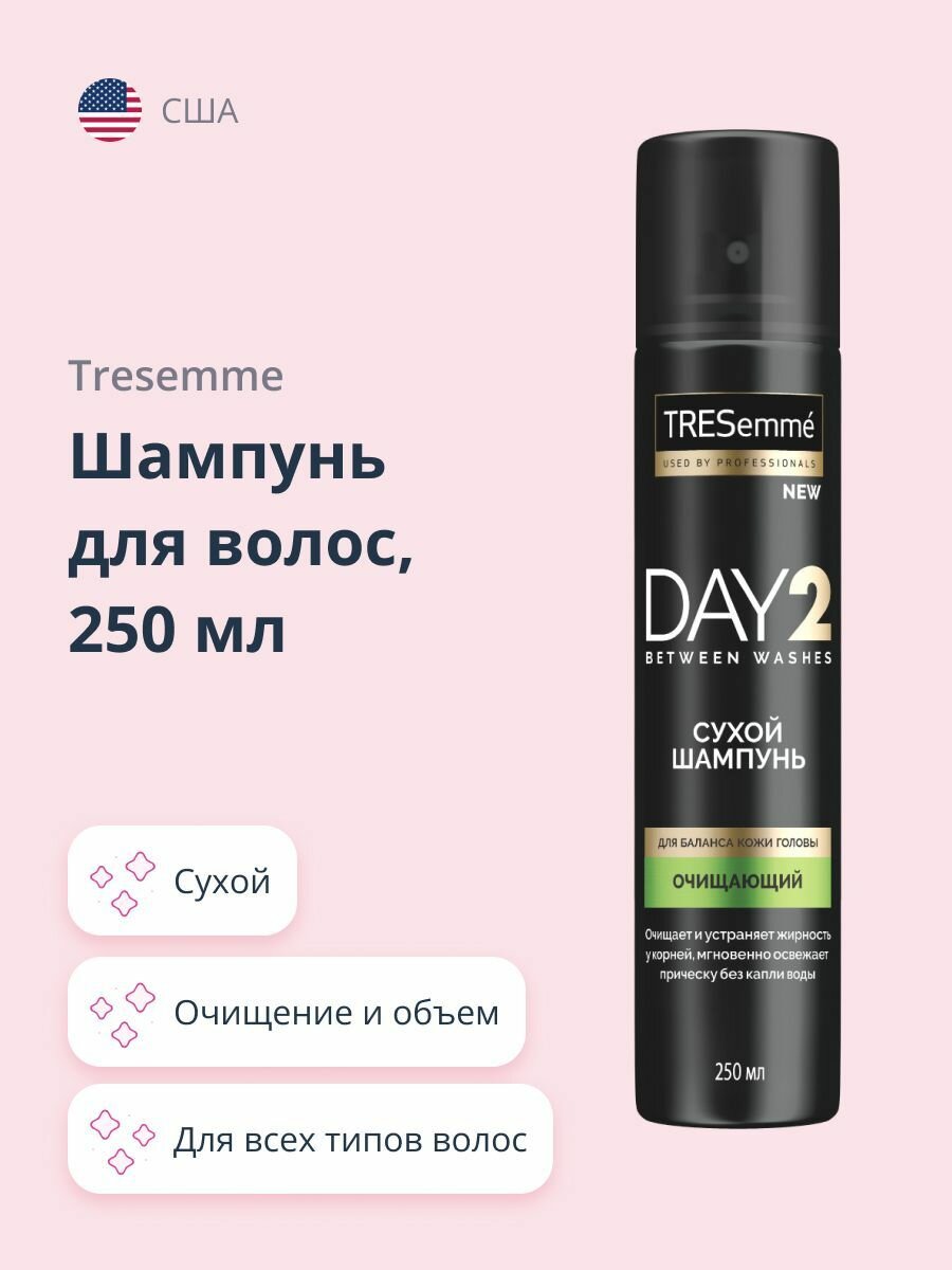 | Дополнительная информация | благодаря технологии невидимого очищения сухой шампунь TRESemme можно использовать даже на темных волосах; можно использовать в качестве стайлинга |