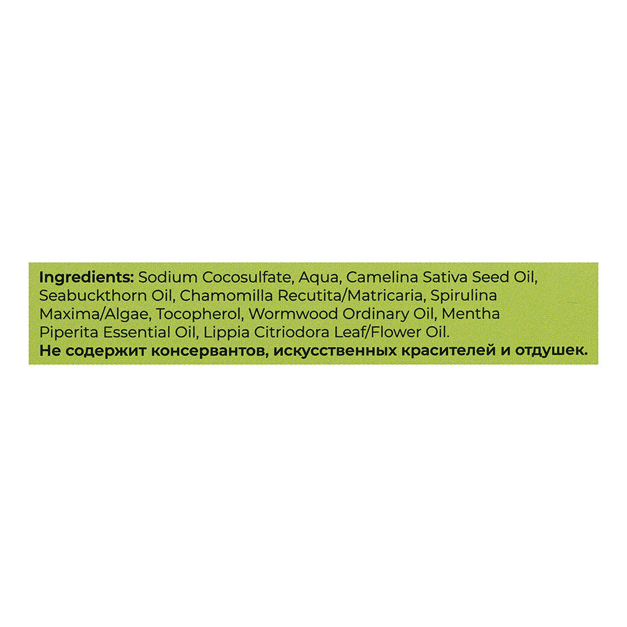 | Состав | кокосульфат натрия, питьевая вода, натуральное масло рыжика, натуральное масло облепихи, сухие цветки ромашки, натуральные водоросли, витамин Е, натуральные эфирные масла полыни, мяты, вербены |