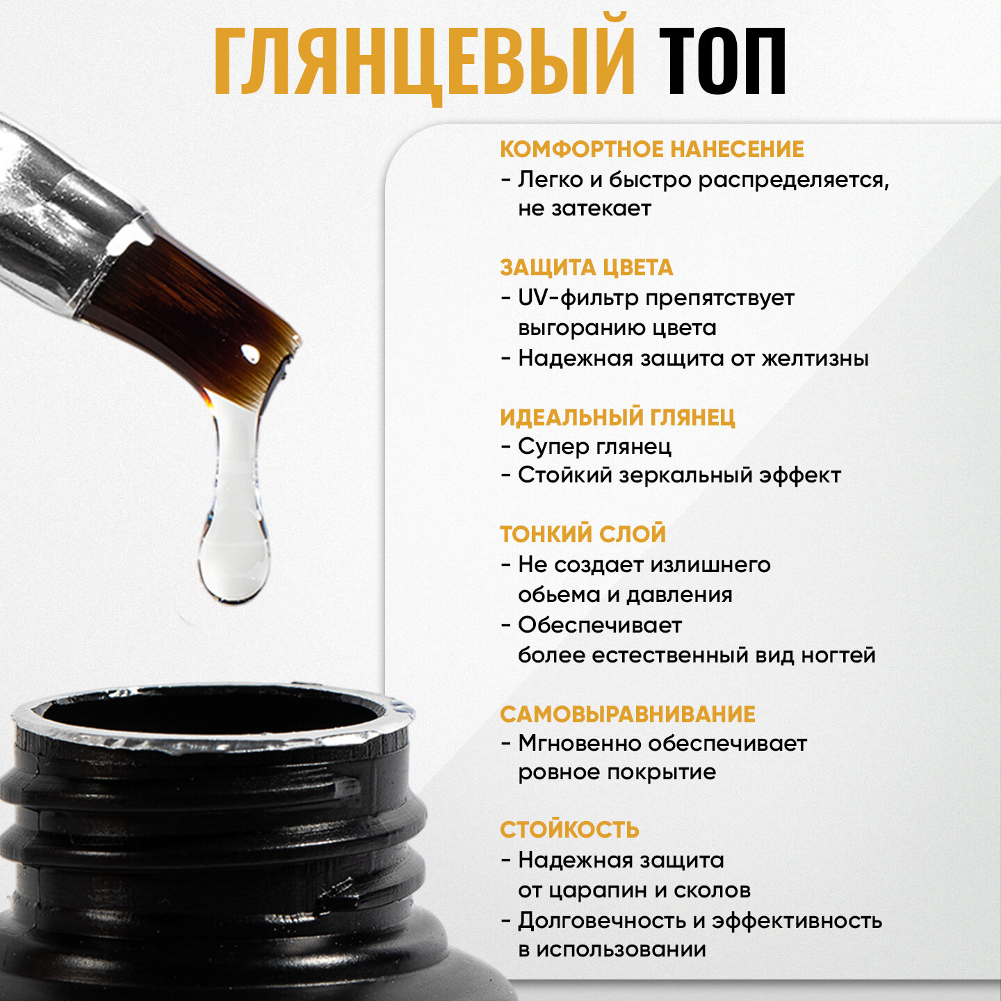 | Способ применения | не снимая липкий слой с цветного гель-лака, нанести топ. Полимеризовать 2 мин/30 сек в УФ/LED-лампе |
