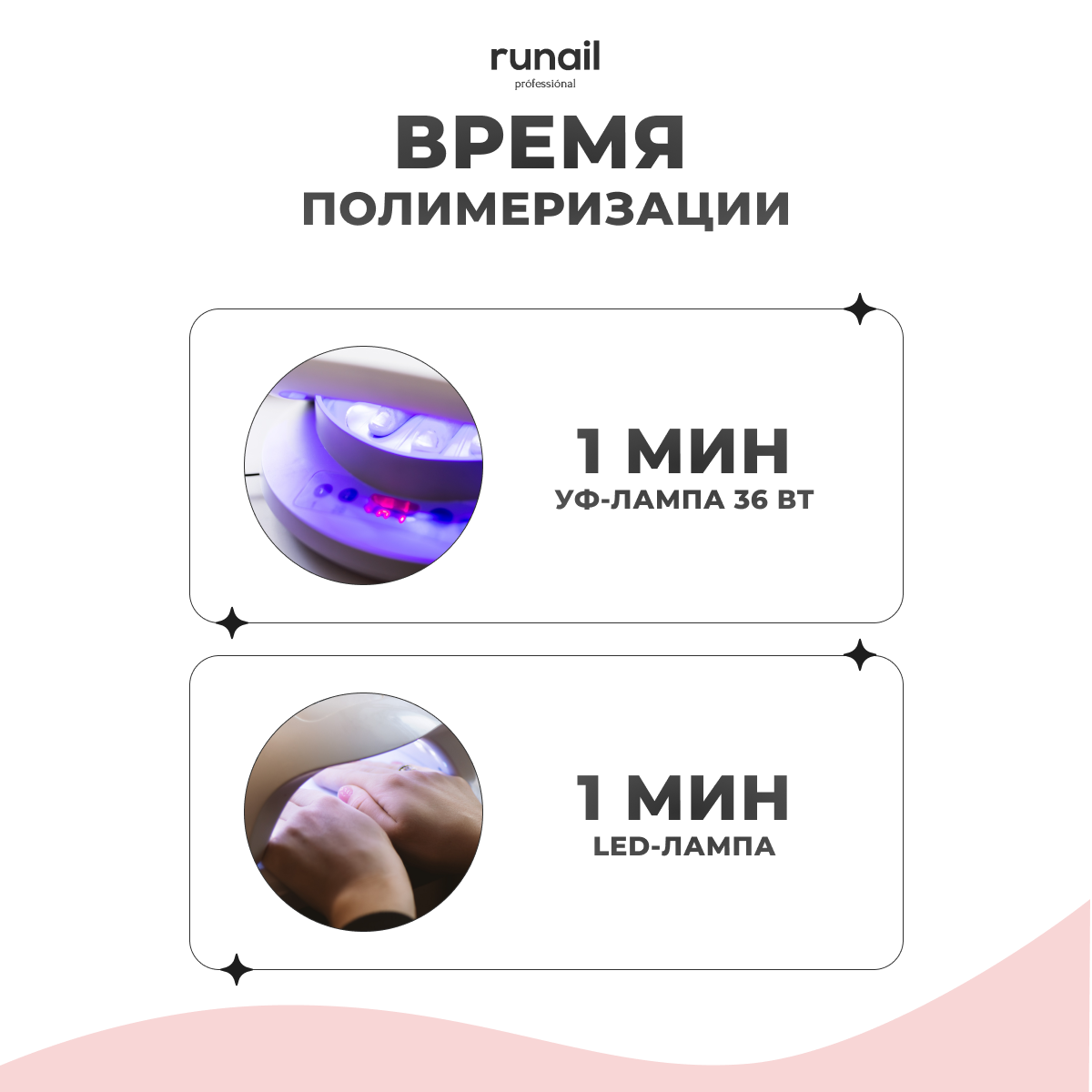 | Способ применения | Подготовка ногтевой пластины (НП): 1. Снять природный глянец с натурального ногтя при помощи бафа или пилки для натуральных ногтей. 2. Выполнить гигиенический маникюр любым привычным способом (аппаратный, обрезной, комбинированный). 3. Нанести на НП дегидратор, подсушить на воздухе 60 сек. 4. Полусухой кистью нанести праймер на НП, подсушить на воздухе 2-3 мин. Базовое покрытие: 1. Нанести первый тонкий слой базы втирающими движениями. 2. Просушить в UV/LED лампе - 60 сек. 3. Выполнить выравнивание или смоделировать архитектуру ногтя. 4. Просушить в UV/L ED лампе - от 60 сек. Нанесение цветного покрытия гель-лаком пошагово: 1. Нанести гель-лак runail GEL POLISH в 1-2 слоя. 2. Каждый слой просушить в UV/LED лампе - 60 сек. Финишное покрытие: 1. Закрепить маникюр финишным покрытием для гель-лака. 2. Просушить в UV/LED лампе - 60 сек. При соблюдении технологии нанесения стойкость маникюра составит до 4-х недель. |