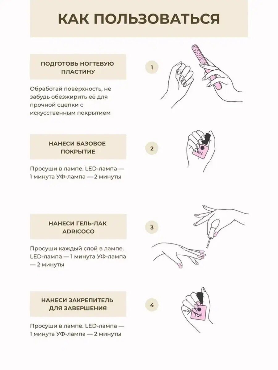 | Способ применения | обезжирьте ногтевую пластину, чтобы очистить ее и нанесите праймер. Равномерно нанесите основу для гель-лака ADRI COCO и сушите в LED-лампе 1 минуту, в UV-лампе 2 минуты. В два слоя нанесите цветной гель-лак ADRI COCO и сушите каждый слой по отдельности в LED-лампе 1 минуту, в UV-лампе 2 минуты после каждого слоя. В качестве закрепляющего покрытия нанесите топ для гель-лака ADRI COCO и сушите в LED-лампе 1 минуту, в UV-лампе 2 минуты. При необходимости удалите липкий слой обезжиривателем. В качестве дополнительного ухода используйте масло для кутикулы |
