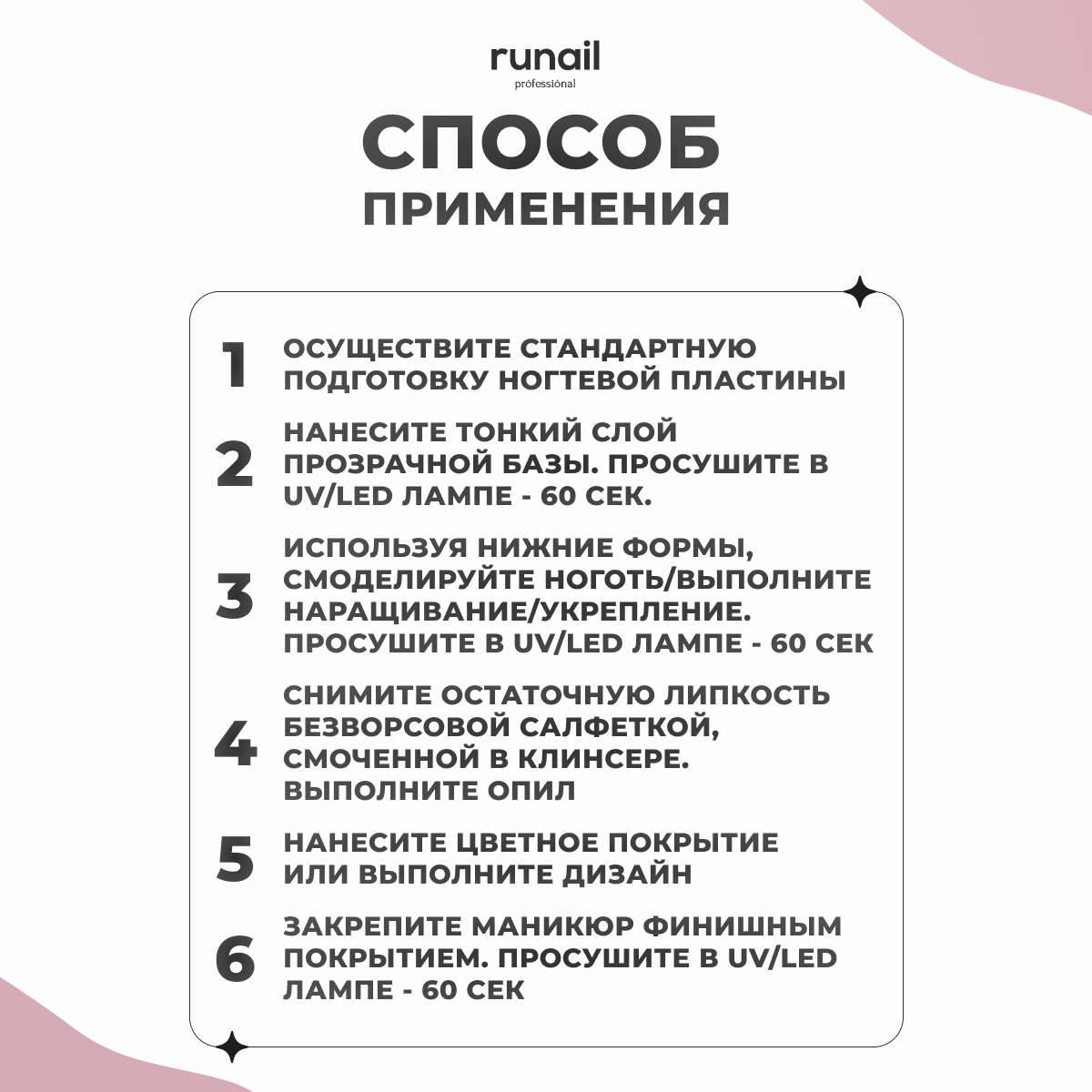 | Способ применения | Подготовка ногтевой пластины (НП): 1. Снимите природный глянец с натурального ногтя при помощи бафа или пилки для натуральных ногтей. 2. Выполните гигиенический маникюр любым привычным способом (аппаратный, обрезной, комбинированный). 3. Нанесите на НП дегидратор, подсушите на воздухе 60 сек. 4. Полусухой кистью нанесите праймер на НП, подсушите на воздухе 2-3 мин. Моделирование: 1. Нанесите тонкий слой прозрачной базы (базовый уф-гель или каучуковая прозрачная база) втирающими движениями. 2. Просушите/заполимеризуйте в UV/LED лампе - 60 сек. 3. Используя нижние формы, смоделируйте ноготь/выполните наращивание/укрепление. 4. Просушите в UV/LED лампе - 60 сек. 5. Снимите остаточную липкость безворсовой салфеткой, смоченной в клинсере. 6. При необходимости выполните опил формы. 7. Нанесите цветное покрытие или выполните дизайн. Финишное покрытие: 1. Закрепите маникюр финишным покрытием. 2. Просушите в UV/LED лампе - 60 сек. |