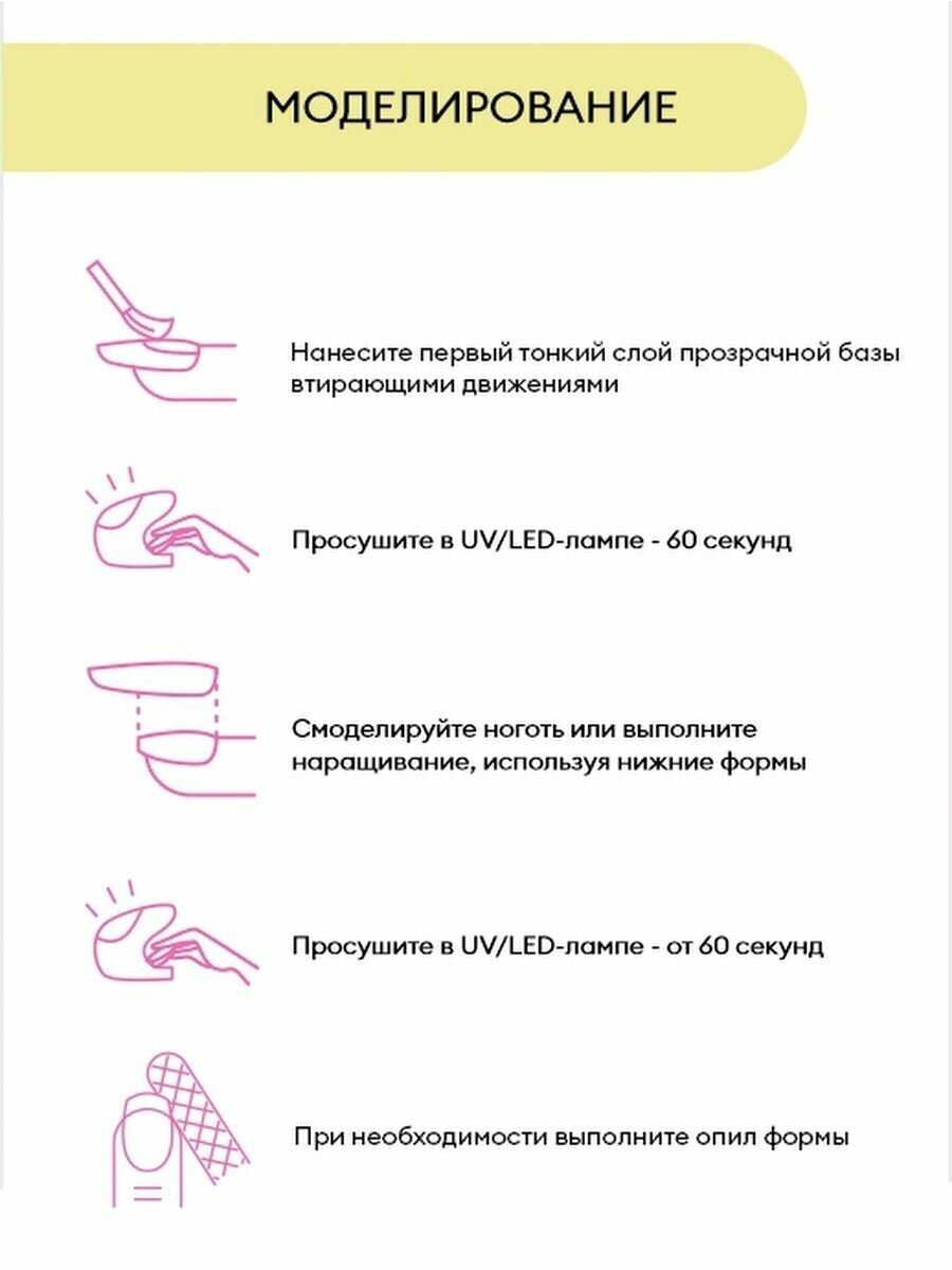 | Способ применения | подготовка ногтевой пластины (нп): 1. снимите природный глянец с натурального ногтя при помощи бафа или пилки для натуральных ногтей. 2. выполните гигиенический маникюр любым привычным способом (аппаратный, обрезной, комбинированный). 3. нанесите на нп дегидратор, подсушите на воздухе 60 сек. 4. полусухой кистью нанесите праймер на нп, подсушите на воздухе 2-3 мин. базовое покрытие: 1. нанесите первый базовый слой втирающими движениями. 2. просушите в uv/led лампе - 60 сек. 3. выполните наращивание или смоделируйте архитектуру ногтя. 4. просушите в uv/l ed лампе - от 60 сек. 5. при необходимости выполните опил формы. нанесение цвета: 1. нанесите цветное покрытие в 1-2 слоя. 2. каждый слой просушите в uv/led лампе - от 60 сек. финишное покрытие: 1. закрепите маникюр финишным покрытием. 2. просушите в uv/led лампе - от 60 сек. при соблюдении технологии нанесения стойкость маникюра - до 4-х недель |