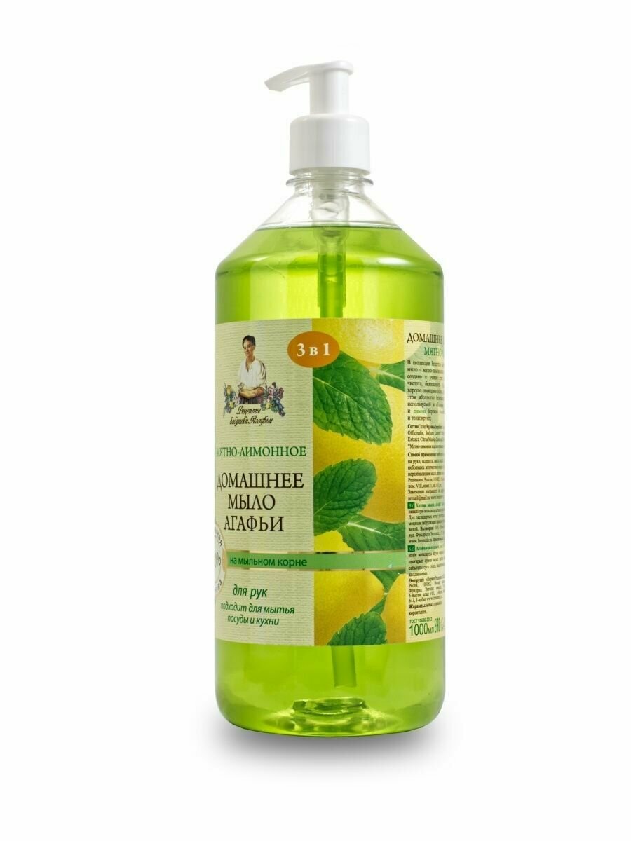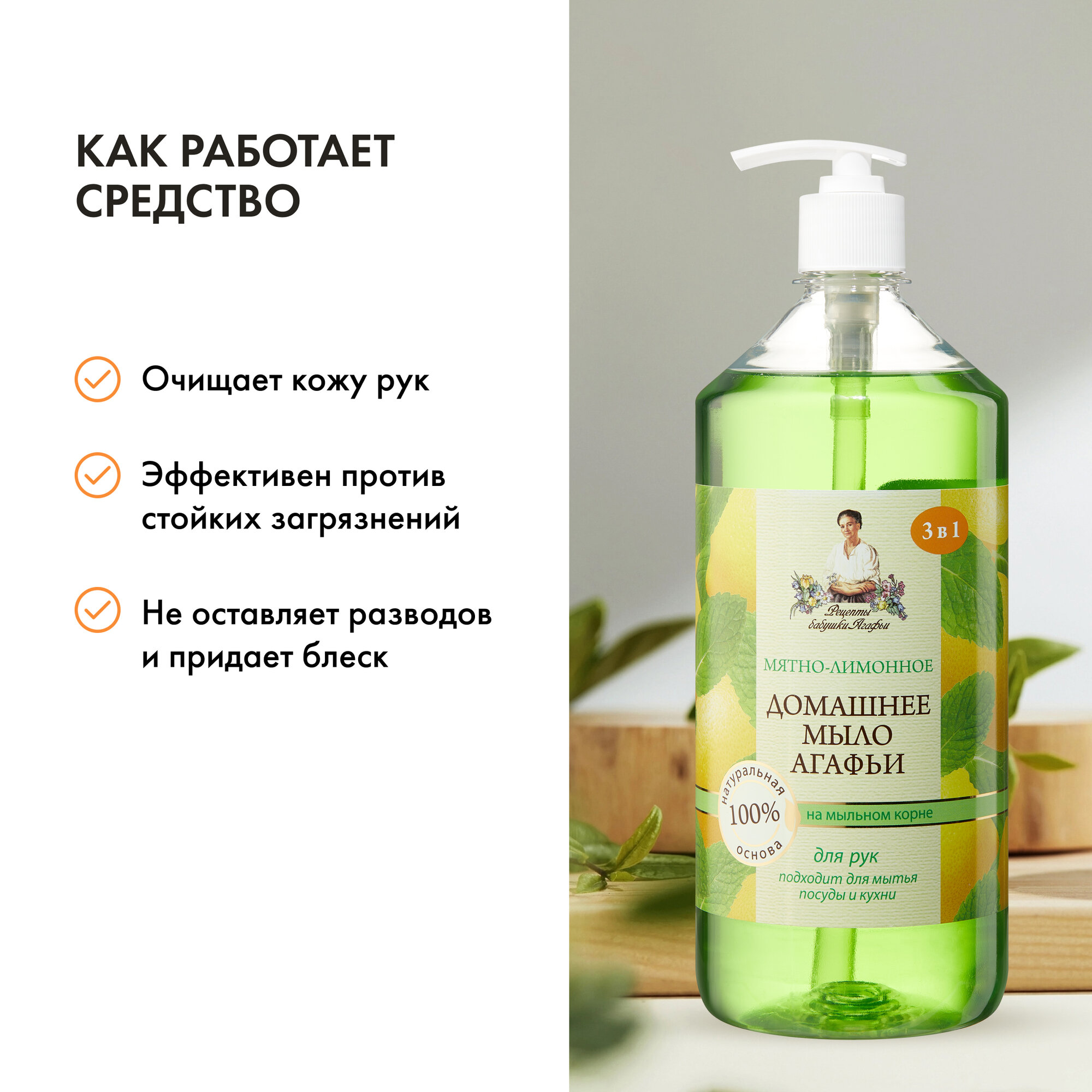 Купить Жидкое мыло для кухни, мытья посуды и рук 3 в 1 Рецепты бабушки Агафьи Домашнее "Мятно-лимонное" 1 л
