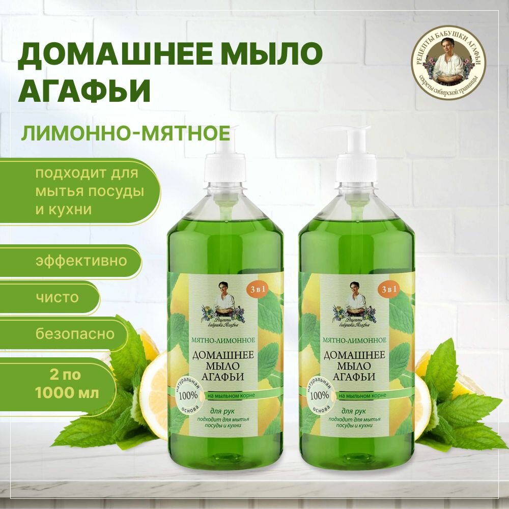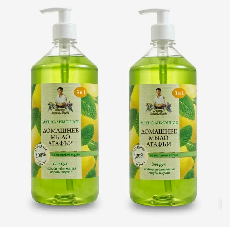 Мыло жидкое Рецепты бабушки Агафьи "Мятно-лимонное" домашнее, 1000 мл 2шт 4607040318216/набор