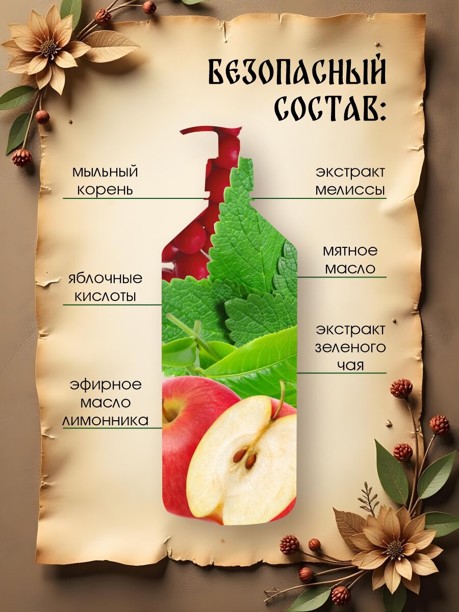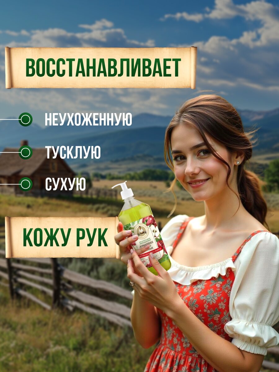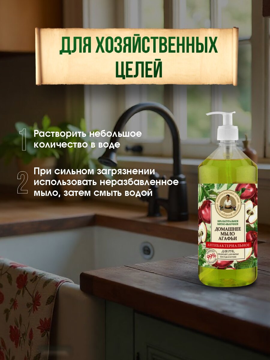Жидкое мыло для кухни, мытья посуды и рук 3 в 1 Рецепты бабушки Агафьи Домашнее "Мятно-яблочное" антибактериальное 1 л интересное: