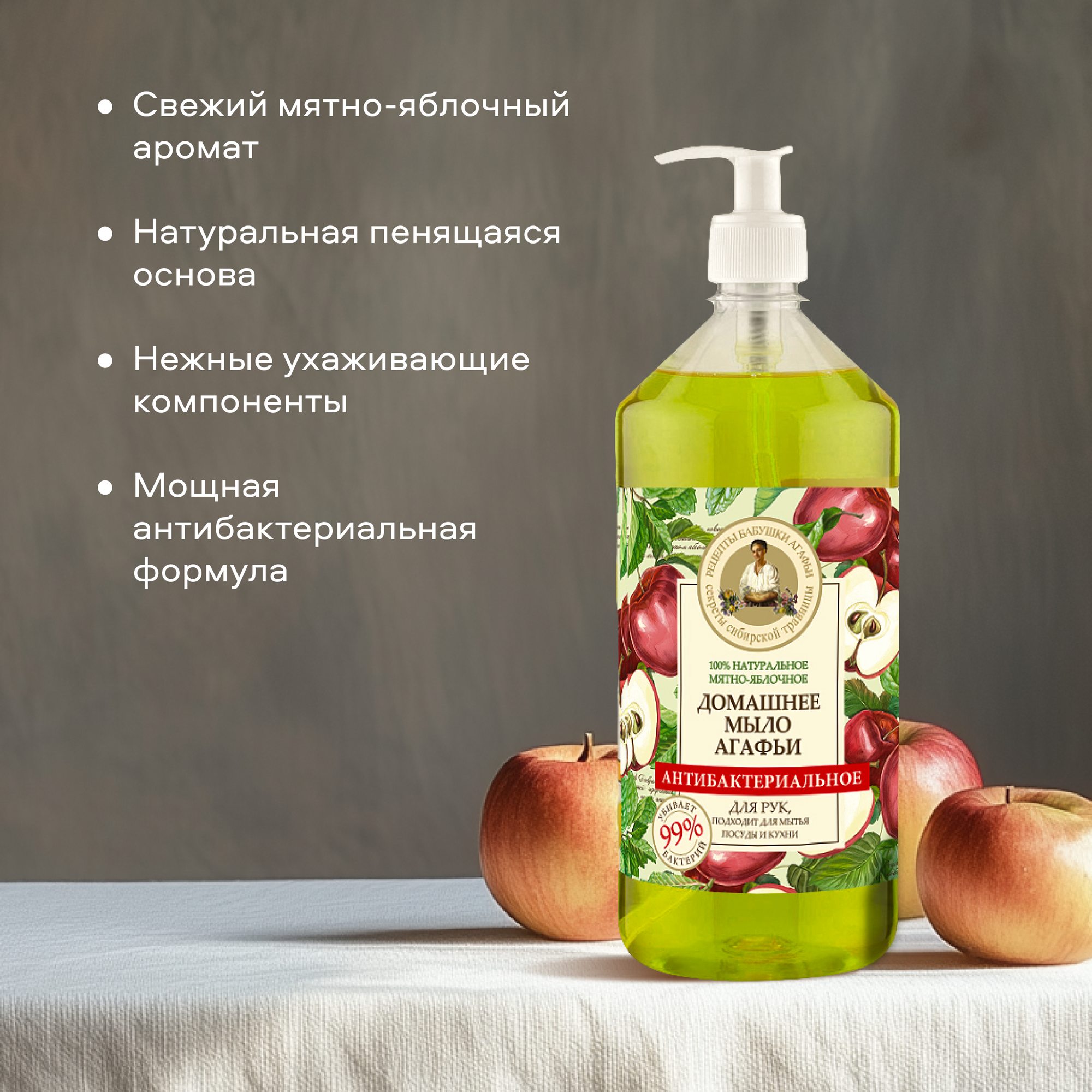 Купить Жидкое мыло для кухни, мытья посуды и рук 3 в 1 Рецепты бабушки Агафьи Домашнее "Мятно-яблочное" антибактериальное 1 л