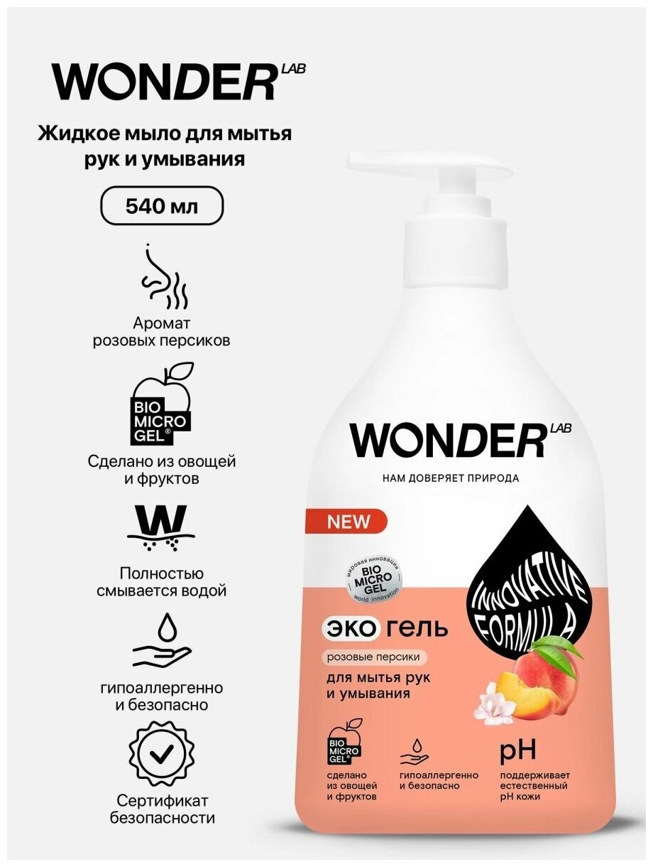 Жидкое эко мыло для рук и умывания с ароматом розовых персиков WONDER LAB, 540 мл