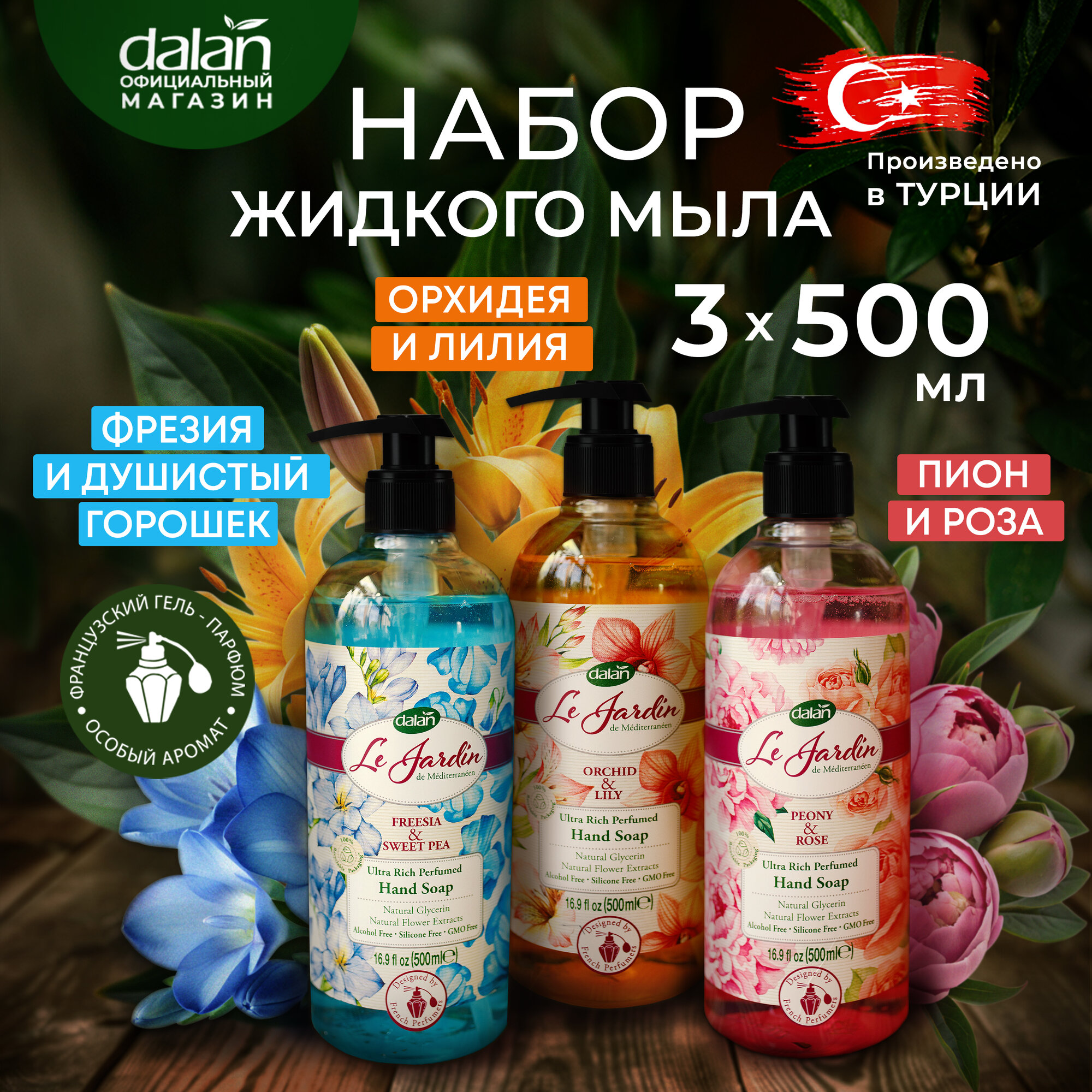 Натуральное турецкое жидкое мыло для рук Dalan Le Jardin туалетное Пион, Орхидея, Фрезия, парфюмированное, набор мыла подарочный 500 мл х 3 шт