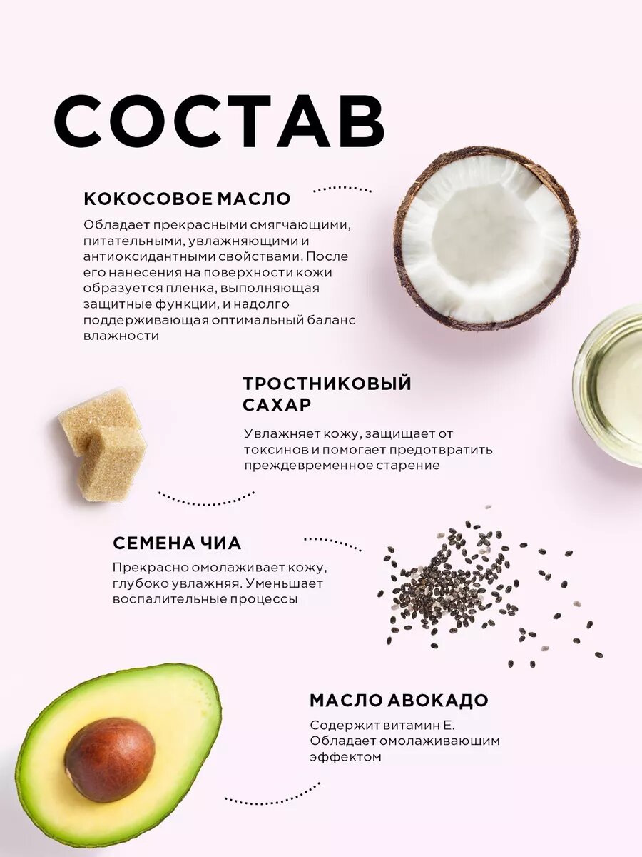 | Отшелушивающее вещество | кокос / кофе / сахар / соль |