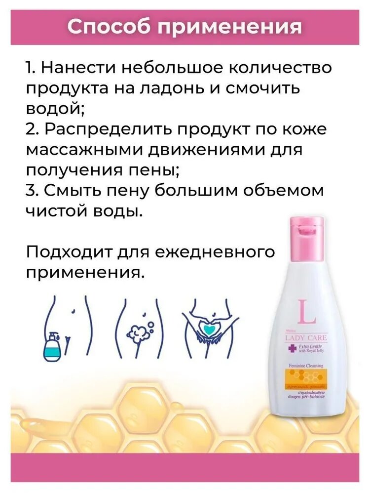 | Дополнительная информация | Налить небольшое количество геля на ладонь, вспенить и использовать для интимной гигиены. Тщательно смыть. Подходит для ежедневного ухода. |