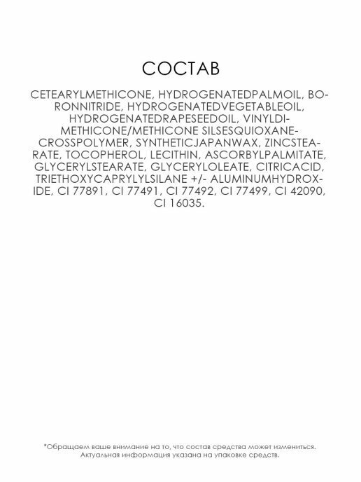 | Состав | cetearyl methicone, hydrogenated palm oil, boron nitride, hydrogenated vegetable oil, hydrogenated рапса oil, винил диметикон/methicone silsesquioxane crosspolymer, japan synthetic wax, zinc stearate, альфа-токоферол, lecithin, ascorbyl palmitate, glyceryl stearate, glyceryl олеат, citric acid, triethoxycaprylylsilane +/- aluminum hydroxide |