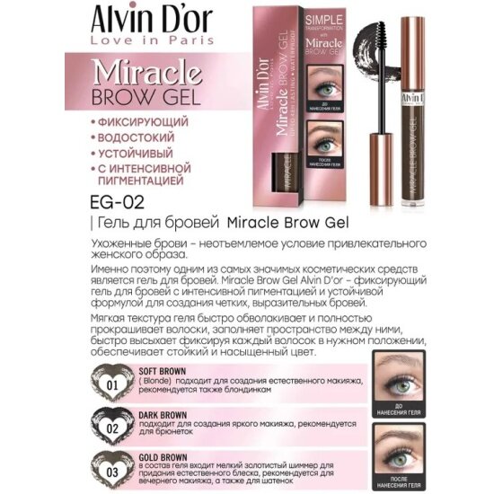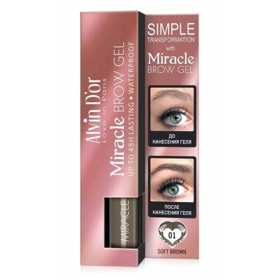 Alvin D'Or Гель для бровей Miracle Brow Gel фиксирующий, водостойкий, пигментированный, тон 01 soft brown