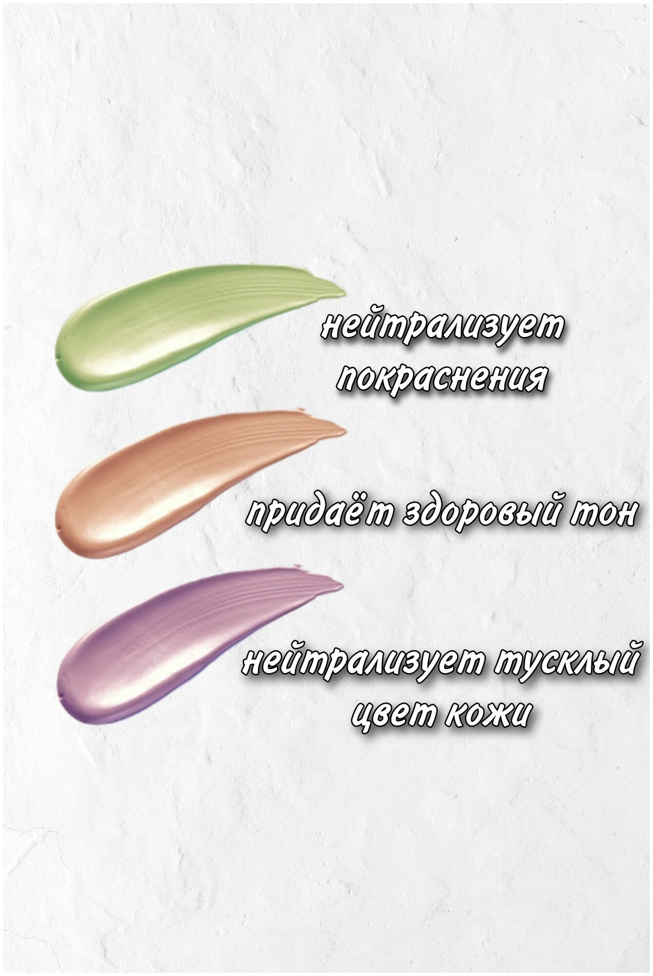 | Дополнительная информация | фиолетовый убирает желтизну лица; зелёный нейтрализует красноту, воспаления и раздражения розовый скрывает неровности кожи даёт мягкий ровный тон |